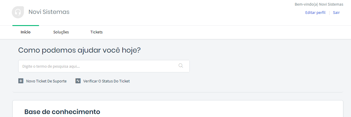 Nessa tela você pode ter acesso a criar um novo ticket, conferir seus tickets já criados que estão em andamentos e você também pode validar nossa base de conhecimento.